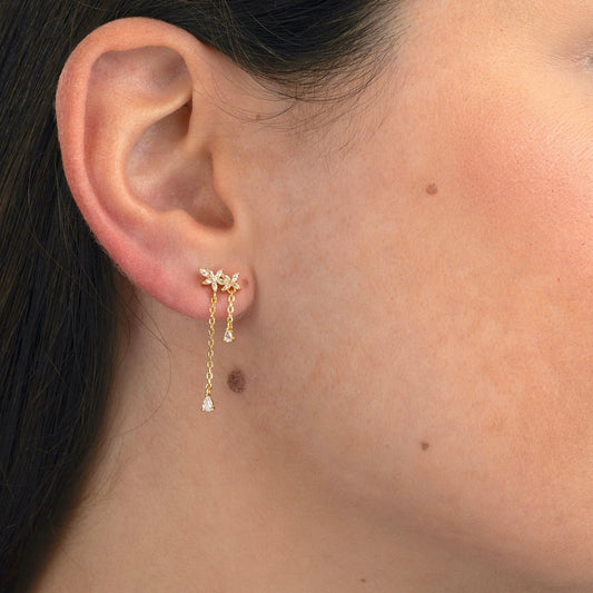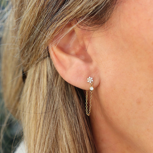 Boucles d'oreilles pendantes fleur zircons et chaine pour femme