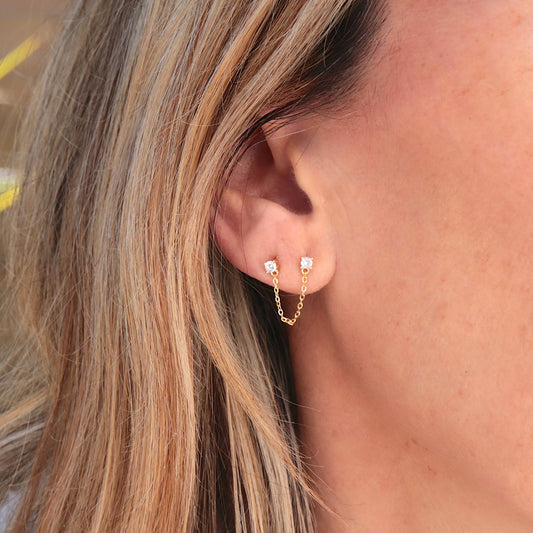 Puces d'oreilles femme deux trous avec chaine doré ou argent