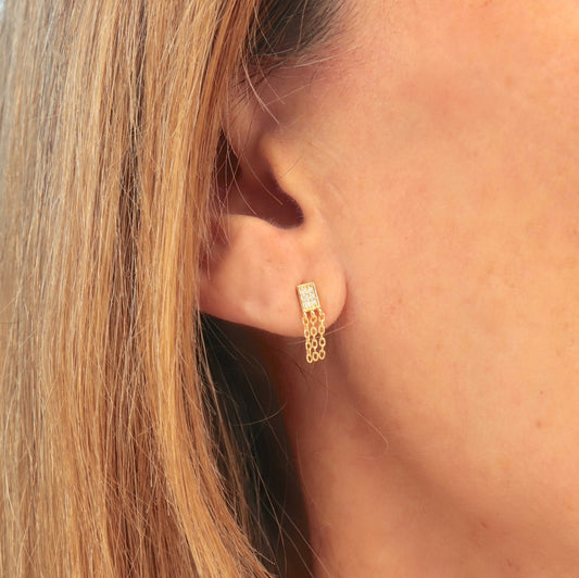 Boucles d'oreilles puces rectangle zircons avec chaines argent ou doré